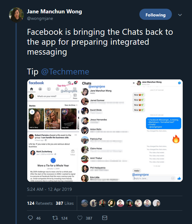 When the chat feature was ousted from the main app, clicking on the messaging icon redirected users to download Facebook’s separate messaging app. Researcher Jane Manchun Wong has spotted that this isn’t the case in the firm’s latest round of tests, as a newly-built “chats” section that displays a list of saved conversations and the ability to send and receive messages.