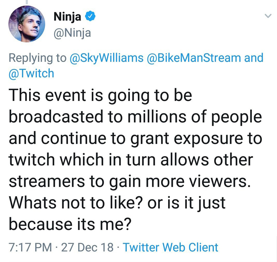 Sky Williams stated that the complaints about the ad rolls are actually giving Blevins more exposure, while Ninja took the poor reception as a personal attack. There are flaws in the now-deleted response from Blevins. The mega-streamer states that the advertisements grant Twitch more exposure which then trickles viewers down to other channels, however the ad rolls are only shown to those already browsing the platform, meaning it primarily serves as a means of bringing the already-existing viewer base towards his New Year’s event.