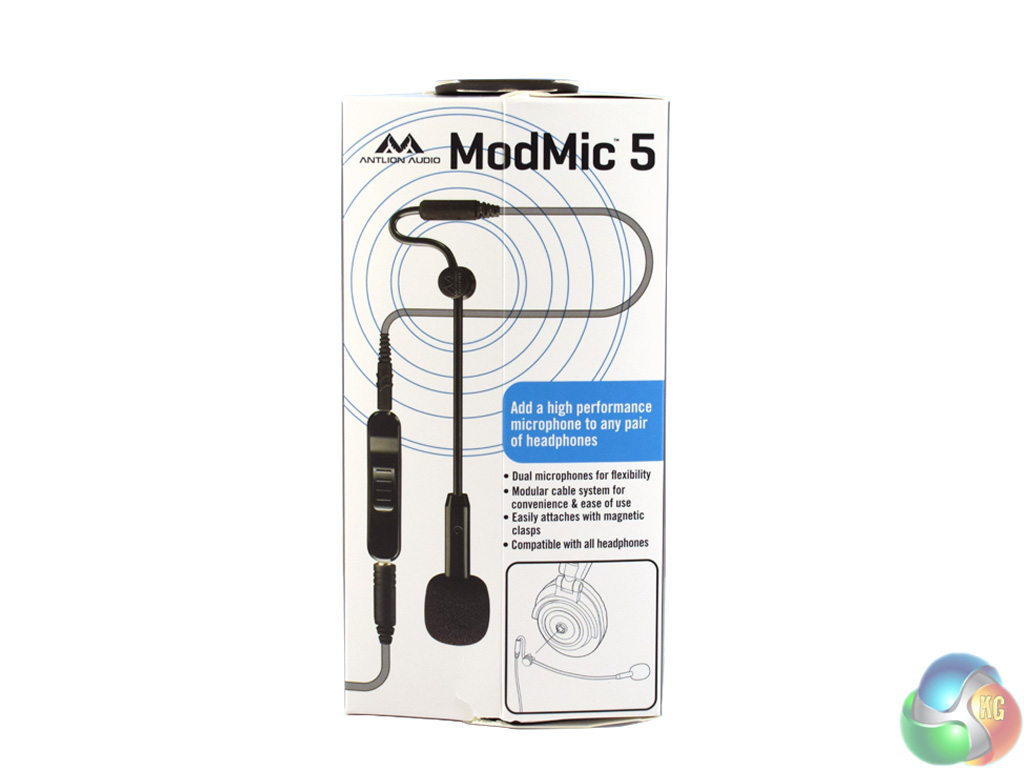 The Antlion Audio ModMic 5 arrives in a small, white box. On the front there is an image of the mic as well as a few key features of the product.