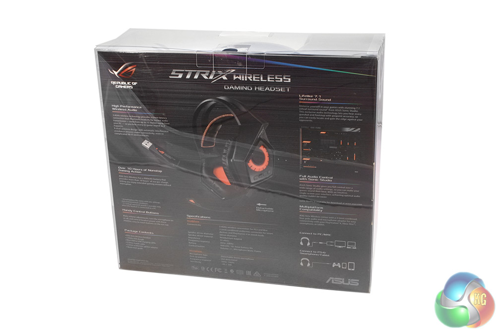The packaging for the ASUS ROG Strix wireless headset is quite eye catching. Not only does it give you a look at the bright orange eye of the headset earcup, but you get a flash of colour underneath the Strix logo. It is all translucent plastic though, so can get quite a good look at the headset before buying if needed.