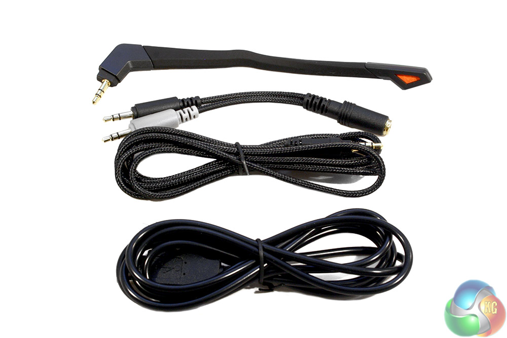 There is a USB-micro USB cable for charging purposes, a boom microphone, a 3.5mm splitter and a 3.5mm extension.