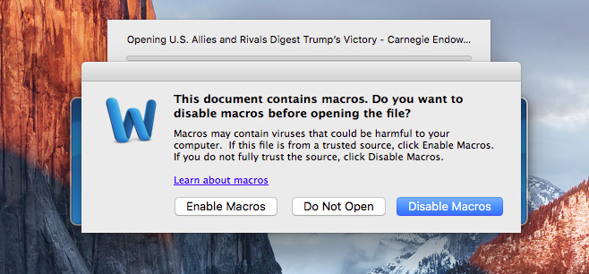 The malware this time around was discovered in an infected Word document called “U.S. Allies and Rivals Digest Trump's Victory – Carnegie Endowment for International Peace.” A surprisingly wordy and official sounding document that seems likely to be targeting a specific group of people.