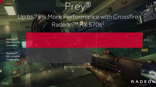 - Up to 78% faster performance using Radeon Software 17.5.1 with Prey DirectX 11 on 4GB Radeon RX 570 multi-GPU than with 4GB Radeon RX 570 single-GPU
