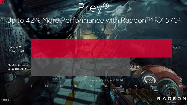 - Up to 42% faster performance using Radeon Software 17.5.1 with Prey on the Radeon RX 570 (4GB) with Nvidia GeForce GTX 1050Ti (4GB) on NV 381.89 with DirectX 11 at 1920×1080 (1080p)
