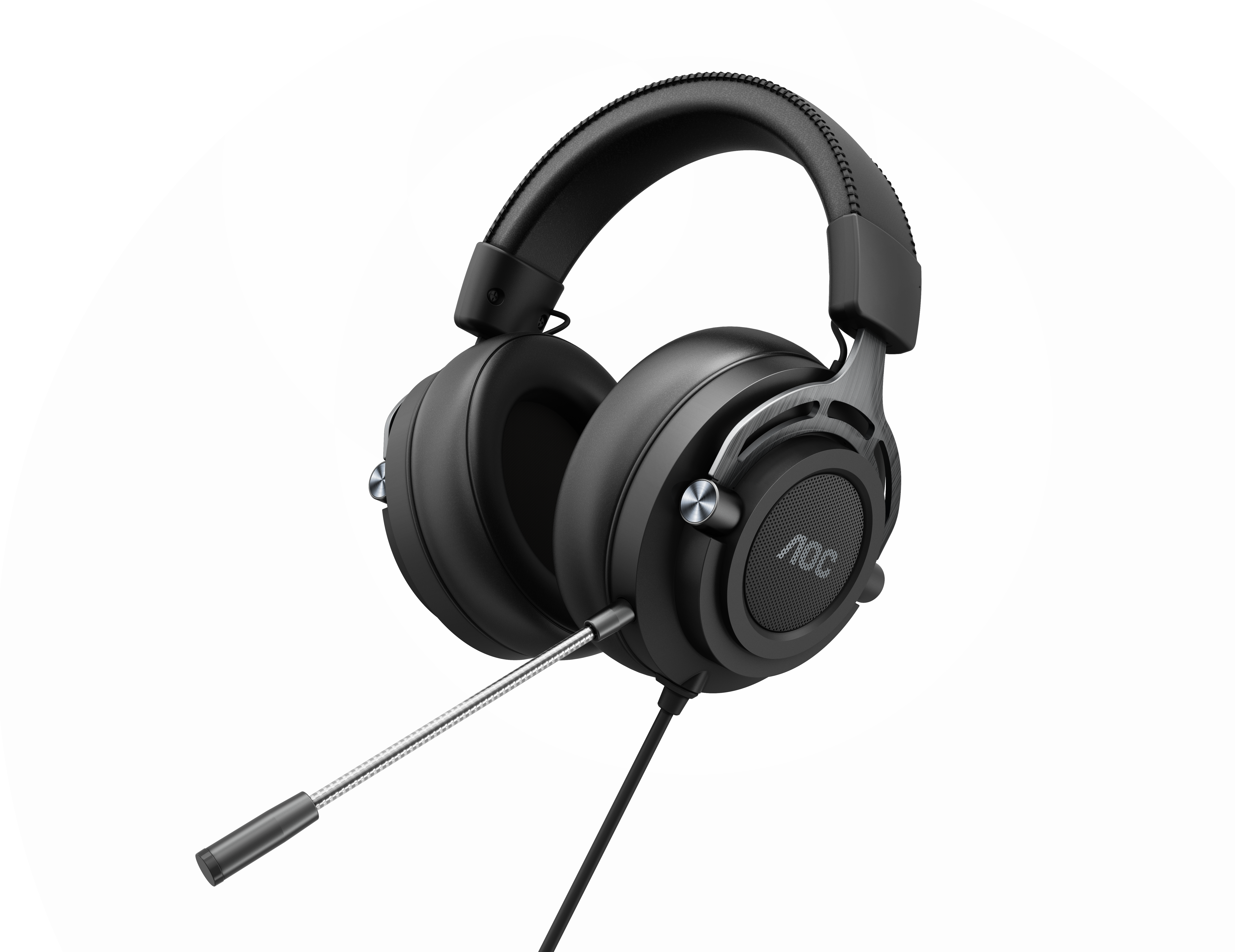 The first headset is the AOC GH200, which uses a sleek and lightweight chassis, foam cushioning, a detachable microphone and 50mm neodymium drivers inside the ear cups. This headset is the cheaper of the two, coming with a gunmetal finish, a 3.5mm headphone jack and a 2 meter braided cable. The headset also comes with a Y-splitter, so microphone and headphone outputs can be split if needed. While this headset doesn't ship with a 7.1 virtual surround sound solution, users can install Windows Sonic or something like Dolby Atmos for Headphones to gain spatial audio.