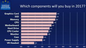 This week, the European Hardware Association presented its 2017 buying trends research report, giving us a hint at what Europeans are most interested in tech-wise in 2017. While there has been growth and plenty of buyer intent as far as CPUs and GPUs go, it looks like interest in virtual reality has dipped a little bit since Q1 2016.