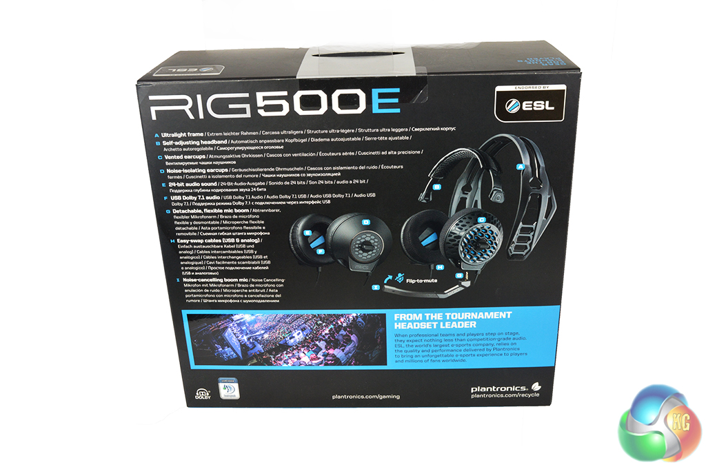 The packaging for the Plantronics RIG 500E is eye catching, shipping in a fairly bulky box with clear plastic on the front and a break down of features on the back.