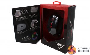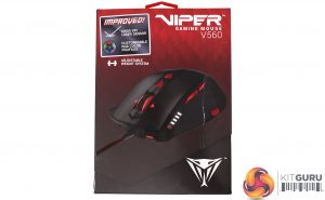 The Viper V560 is packaged in Patriot’s signature red and black theme, with the product proudly displayed in the upper centre, it’s title in the top right and Viper’s snake head logo in the bottom right. While some details are shown on the front cover, opening the window reveals most of what the mouse has to offer.