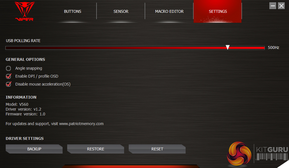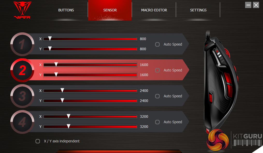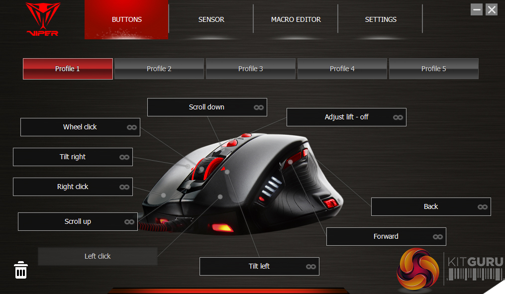 Starting with the software, Patriot has spread its options throughout four primary tabs: Buttons, Sensor, Macro Editor and Settings. This allows quick and easy access to many of the functions, such as the Buttons menu allowing the user to see all of the current set functions, as well as flicking through each profile.