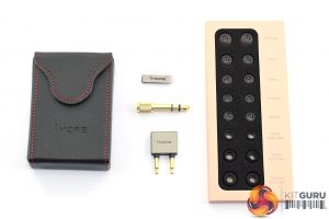 The included accessories are certainly plentiful, with a hard leather carry case, a small shirt clip, 3.5mm-to-6.35mm jack adapter and an aeroplane adapter complimenting the 9 different pairs of included ear tips (8 pairs come separately, the ninth pair is already attached to the earphones). Incidentally, the ear tips are labelled for size, which is a nice touch if you know which measurements suit your ears best. Three pairs are made of foam, while the rest are silicon.