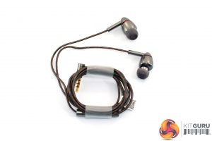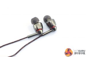 Positioned on the right-hand earbud cable, we also find a small in-line controller. This is again made from aluminium, and features three buttons – when used with my Android Huawei P20 Pro, the top and bottom buttons were used for volume control, while the middle button was used for play/pause functionality when music was playing, or for answering any incoming calls.