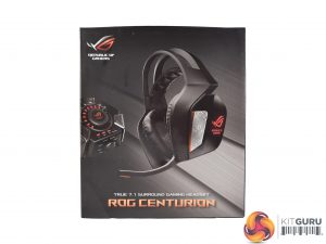 The ASUS ROG Centurion 7.1 ships in a large, dark grey box. On the front is a product photo as well as some ROG branding.