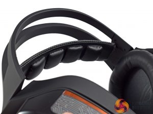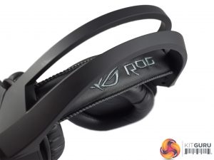 Moving up to the headband, the headband itself features a stitched ROG logo. Above the headband, though, is a hard-plastic support beam which provides rigidity and stability while you are wearing the headset.