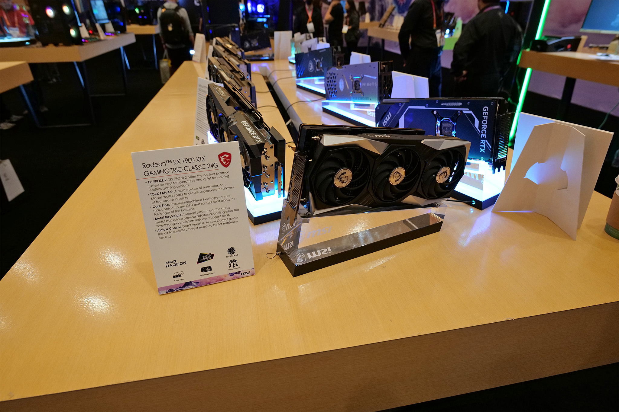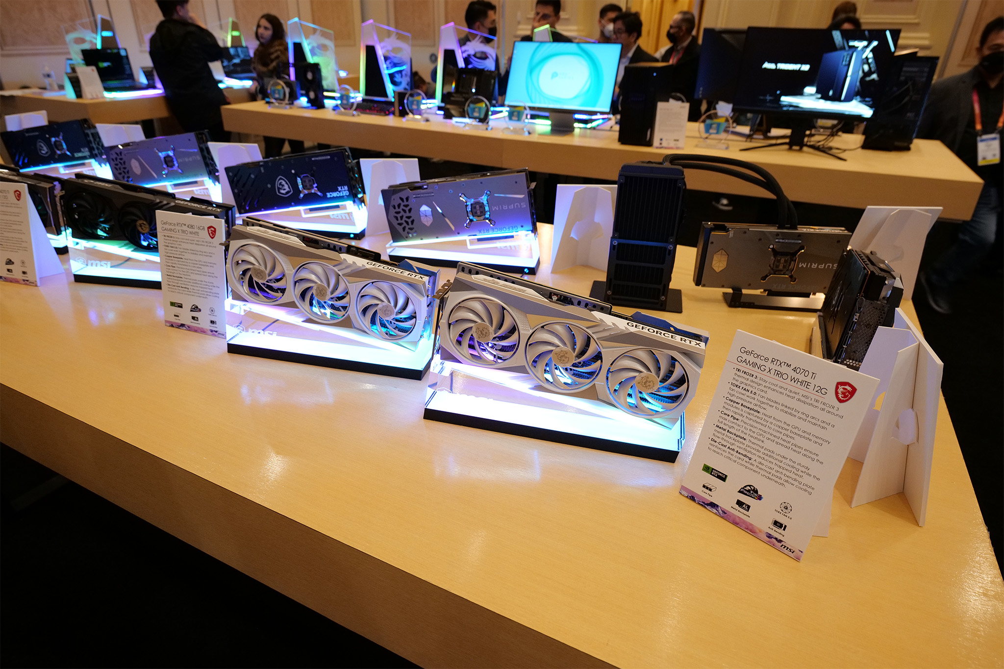 Of course, MSI also had a range of graphics cards on show, including new RTX 4070 Ti models, and the rather tasteful Gaming X Trio White designs, which are aimed to tap into a growing trend for white hardware, which now has a marketshare of 10-20%. Interestingly, the 7900 XTX Gaming Trio Classic was on show, with MSI opting for a heatpipe cooler instead of a vapour chamber, which may be interesting considering the current drama around the AMD reference design. MSI was also showcasing the RTX 4090 Suprim Liquid X, which we reviewed back in October.