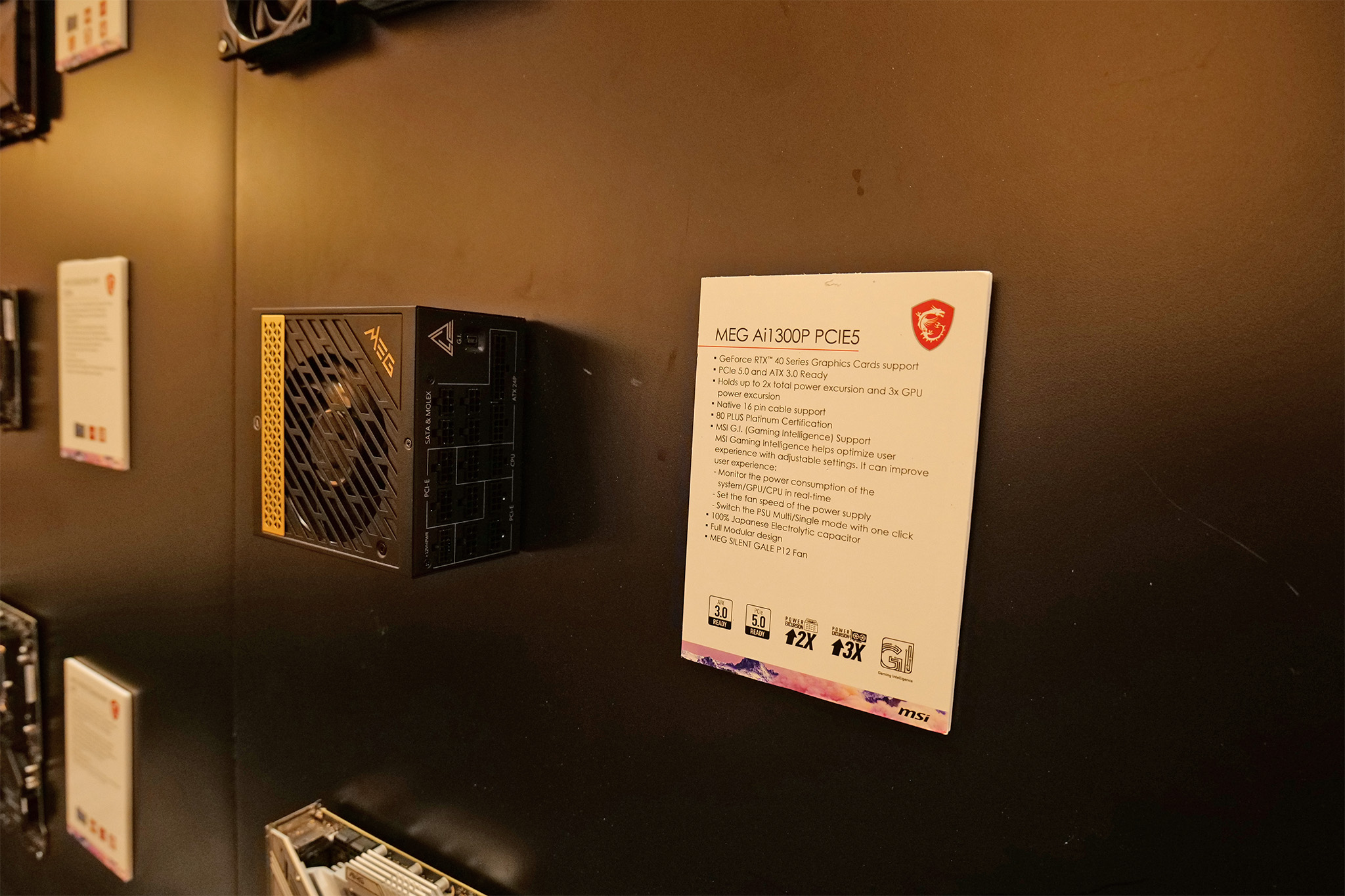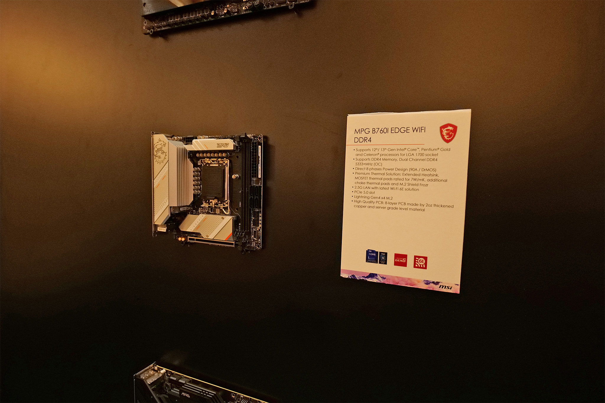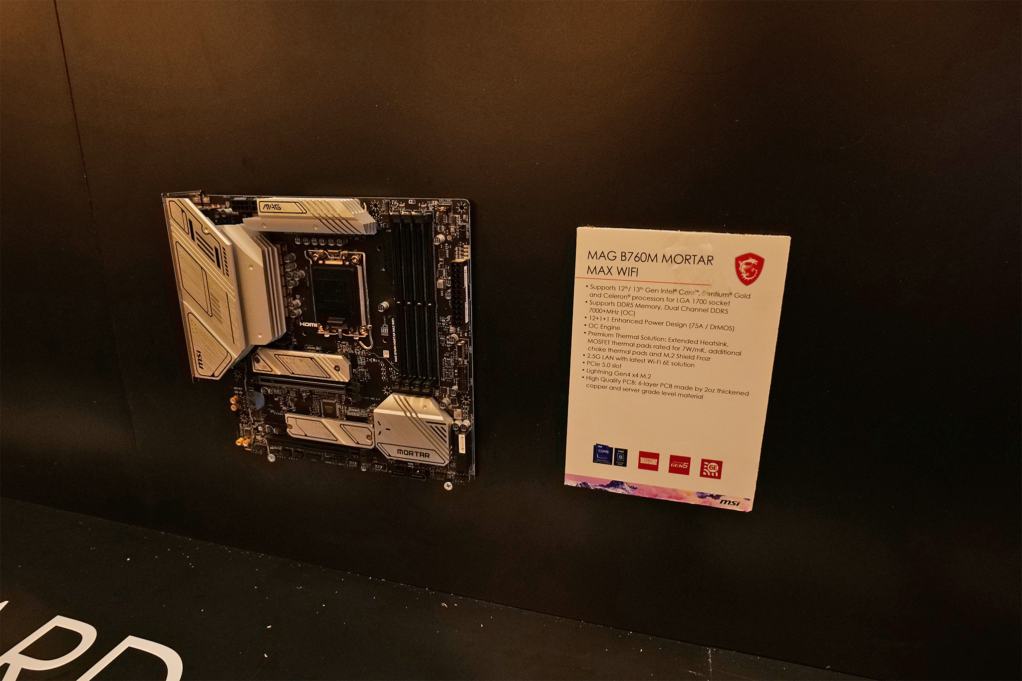 Rounding out the showcase, Leo took a look at some new B760 motherboards for Intel 13th Gen CPUs. MSI highlighted one Micro-ATX model, in the form of the Mortar Max WiFi, while the MAG B760 Tomahawk WiFi is a standard ATX board priced at $250. There was a mini-ITX board too, the MPG B760i Edge WiFi DDR4, with some large heatsinks on show. MSI was also demonstrating its variety of Silent Gale fans, alongside the MEG Ai1300P ATX 3.0/PCIe 5.0 power supply which we reviewed last year.