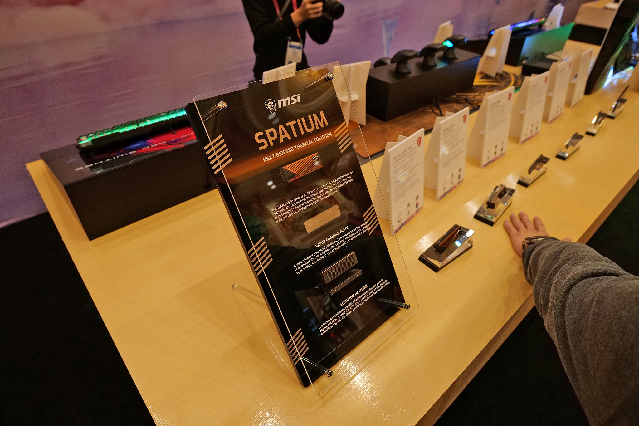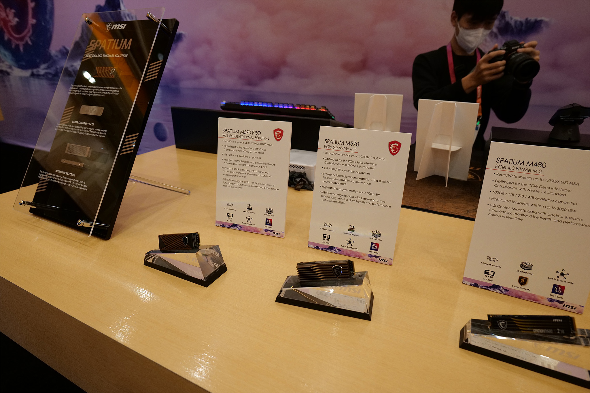 First of all, Leo stopped by to check out MSI's newest Spatium SSDs. As expected, we got a look at a couple of PCIe Gen5 drives, with the Spatium M570 Pro offering speeds up to 12GBs read and 10GBs write, while the Spatium M570 (non-pro) is slightly slower with 10GBs read/write speeds. We're told both drives use Phison's latest Gen5 controller, but different NAND allows for different speeds – and presumably lower pricing for the non-Pro model.