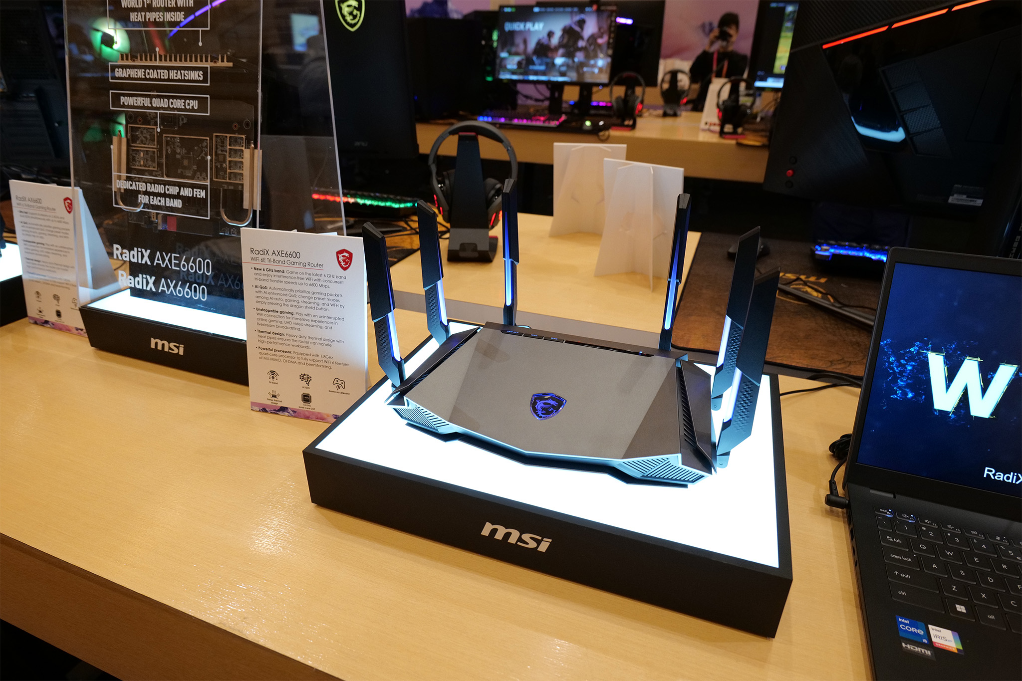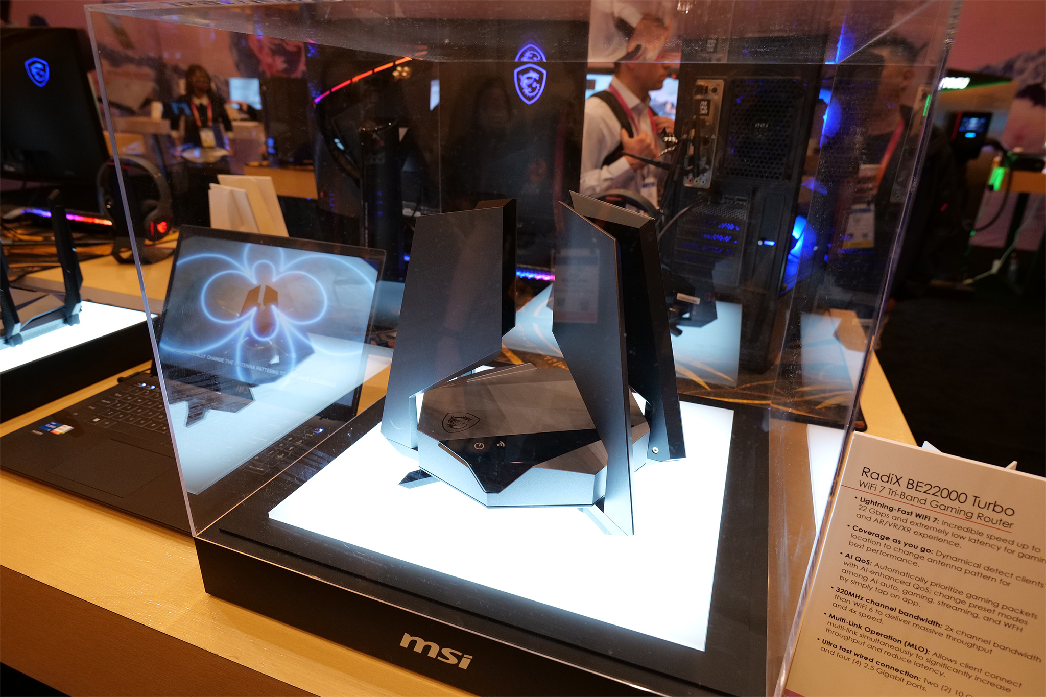 Perhaps one of the more eye-catching products on show, however, is the new range of routers from MSI. Known as the RadiX series, we're told these have a focus on QoS and actually use AI to reduce ping rate. That's alongside the fact the RadiX BE22000 Turbo model has movable antennae to offer the best possible coverage, and it is slated to support WiFi 7 either later this year or early next. We also got a look at the RadiX AXE6600, offering support for WiFi 6E, with an impressive cooling array too, being the world's first router to use heatpipes.