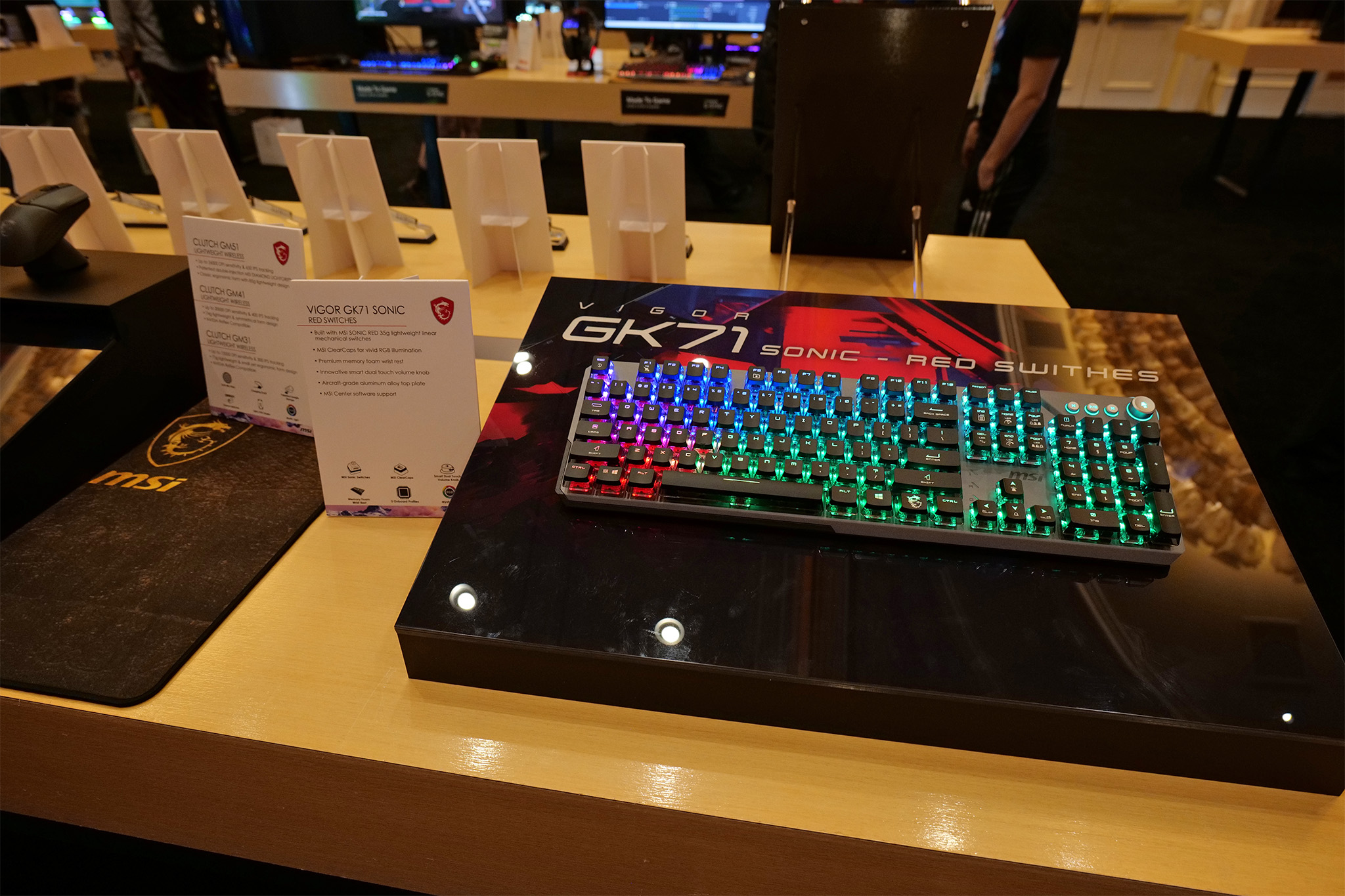 Next the chaps took a look at some new peripherals, starting with the Vigor GK71 Sonic. This offers MSI's own-brand switches, with a choice of Red or Blue variants, and these look to be lower-cost than Cherry MX while offering a similar feel and 45g actuation. We also got a look at the GM51 Clutch Wireless, offering an 85g weight and textured grips known as ‘MSI Diamond Lightgrips'.
