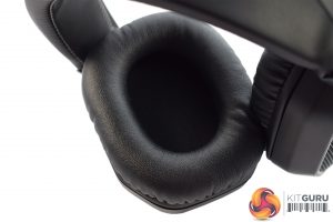 On the inside, the foam ear cushions are finished with some faux-leather, while we can clearly see the cups are oval shaped and circumaural.