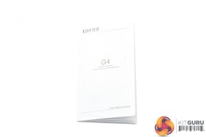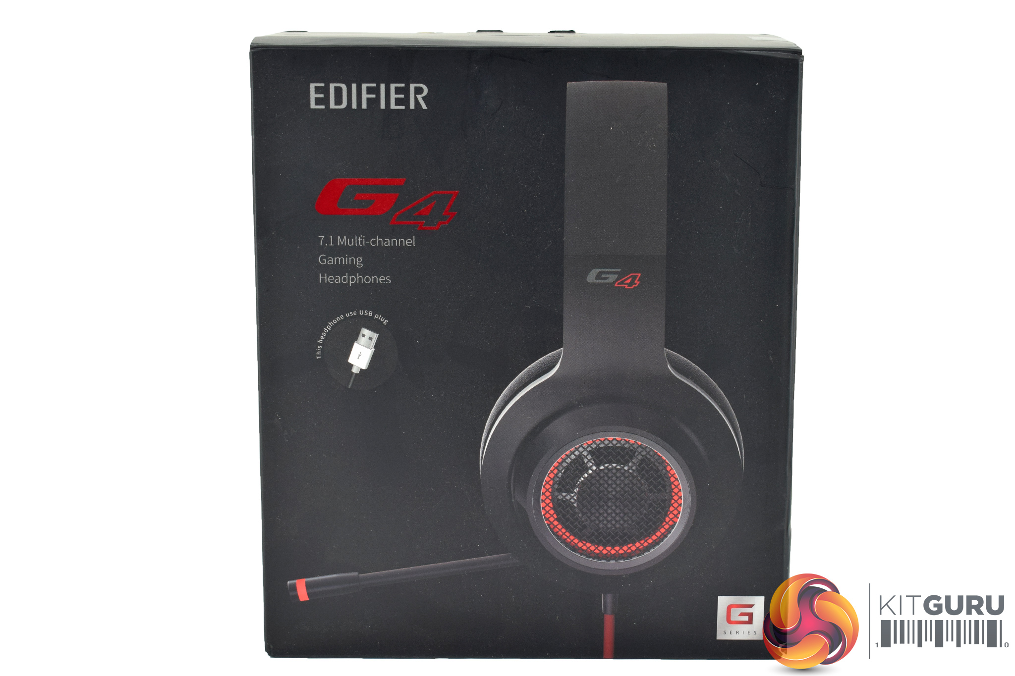 The Edifier G4 ships in a black box with very little colour visible. A large product photo dominates the front of the box.