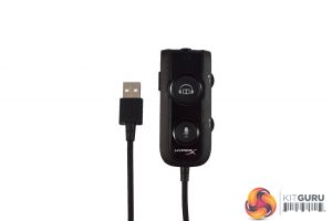 The last accessory is the Dolby dongle. It is this dongle which provides the 7.1 virtual surround-sound, while it also sports two separate volume wheels – one for headphones, another for the mic. On the bottom left-hand side, there is also another button which you can use to alternate between 3 EQ presets. This dongle does connect via USB, as it has to provide digital surround, but it also gives you an extra 2.2m of cable length.