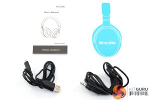 Inside, two small booklets are included: one quick-start guide and one customer feedback pamphlet. Two cables are also included: one micro-USB charging cable and one 3.5mm-to-3.5mm headphone cable.
