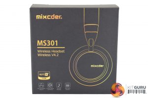 The Mixcder MS301 ships in a black box with gold accenting on the front. Instead of an actual product photo, the outline of the headphone is also printed in gold.