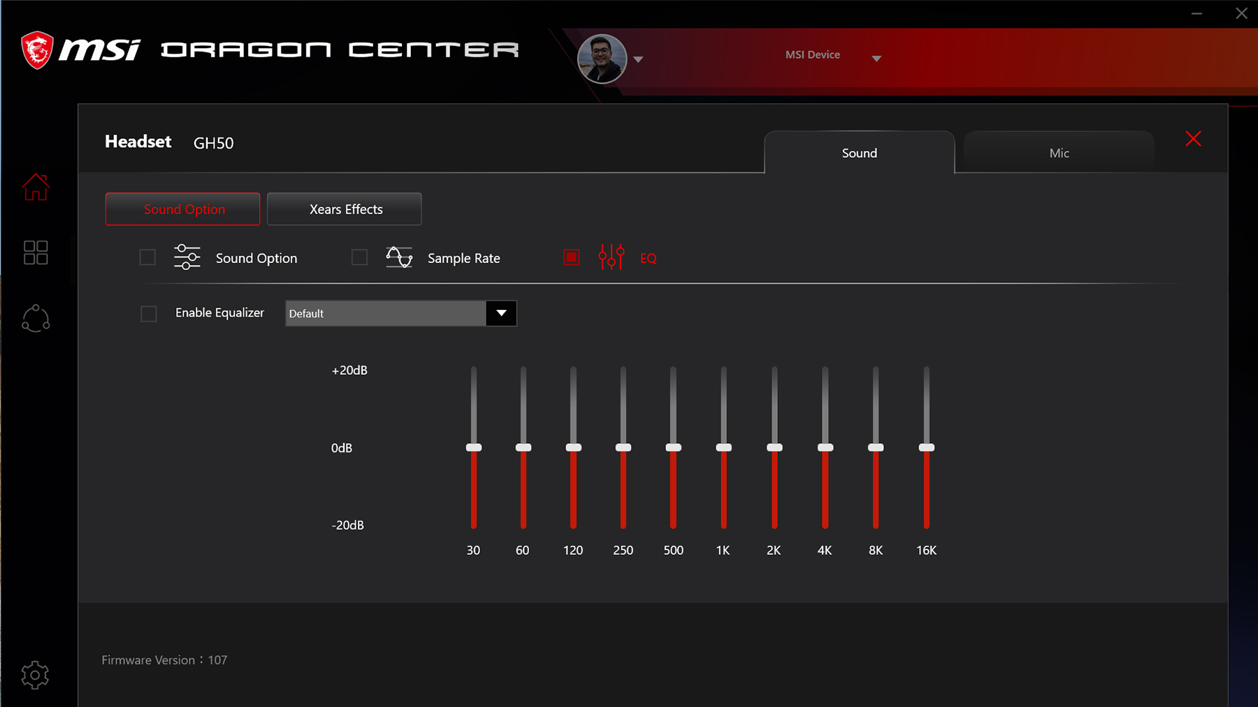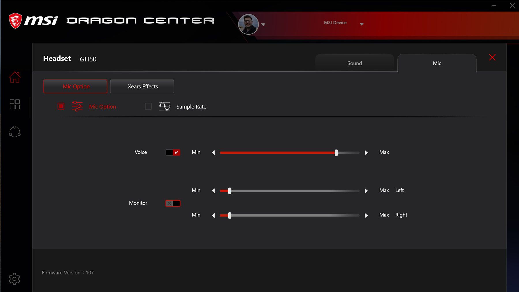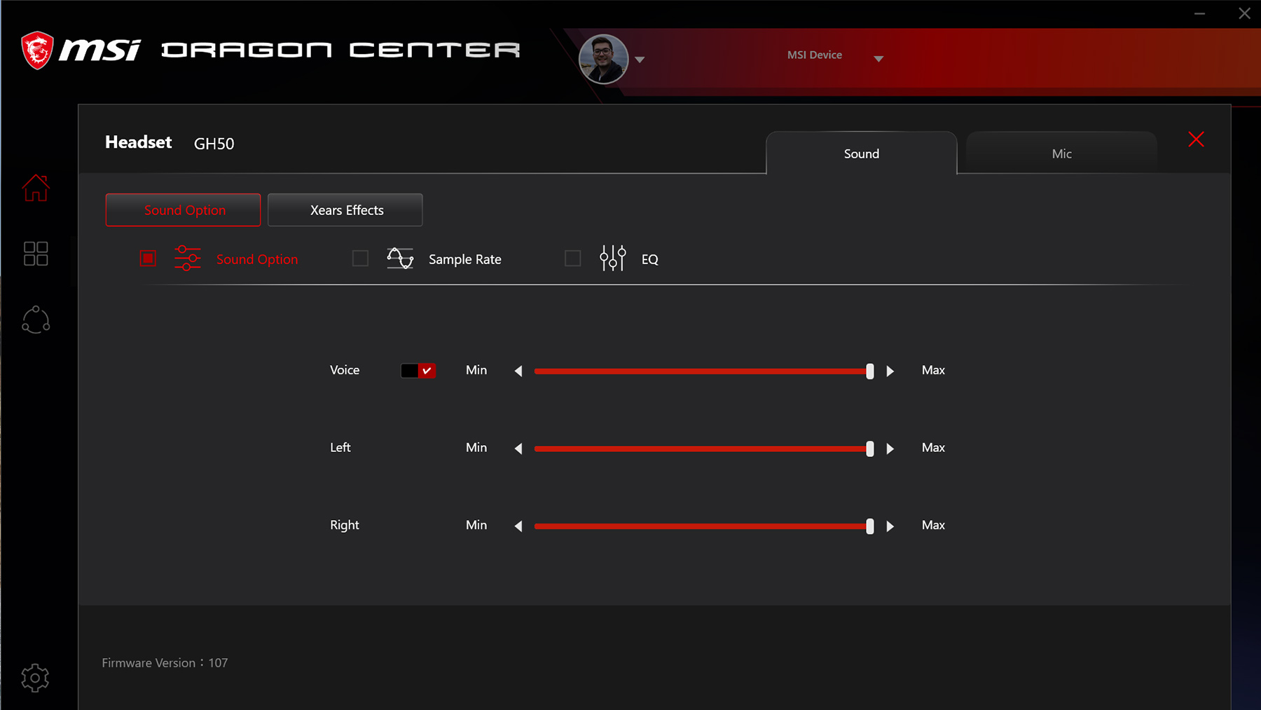 There's a few different tabs for the GH50 when you get into Dragon Center, but it's essentially split into ‘sound' and ‘mic' sections. Starting with the sound, the basic options are pretty straightforward – you can adjust volume levels for the left and right channels, choose your desired sample rate, and then adjust the headset EQ if you want to do so.