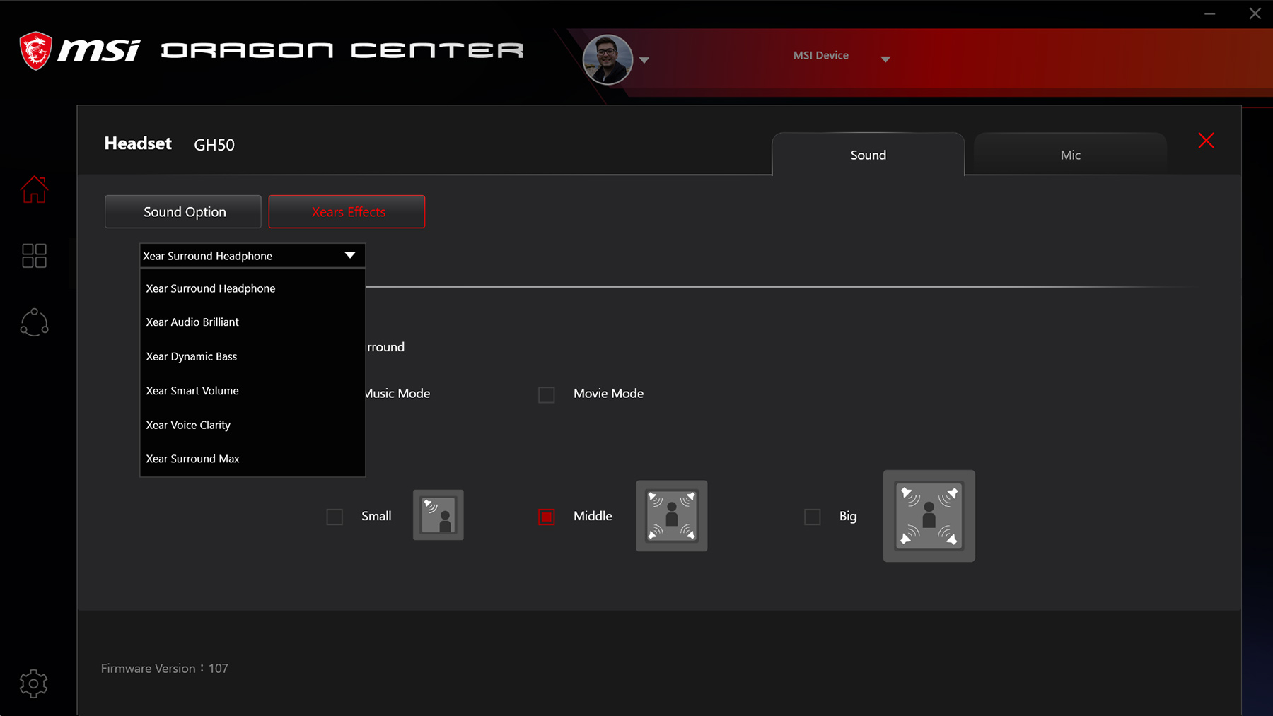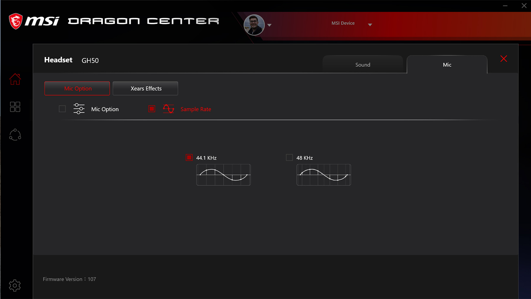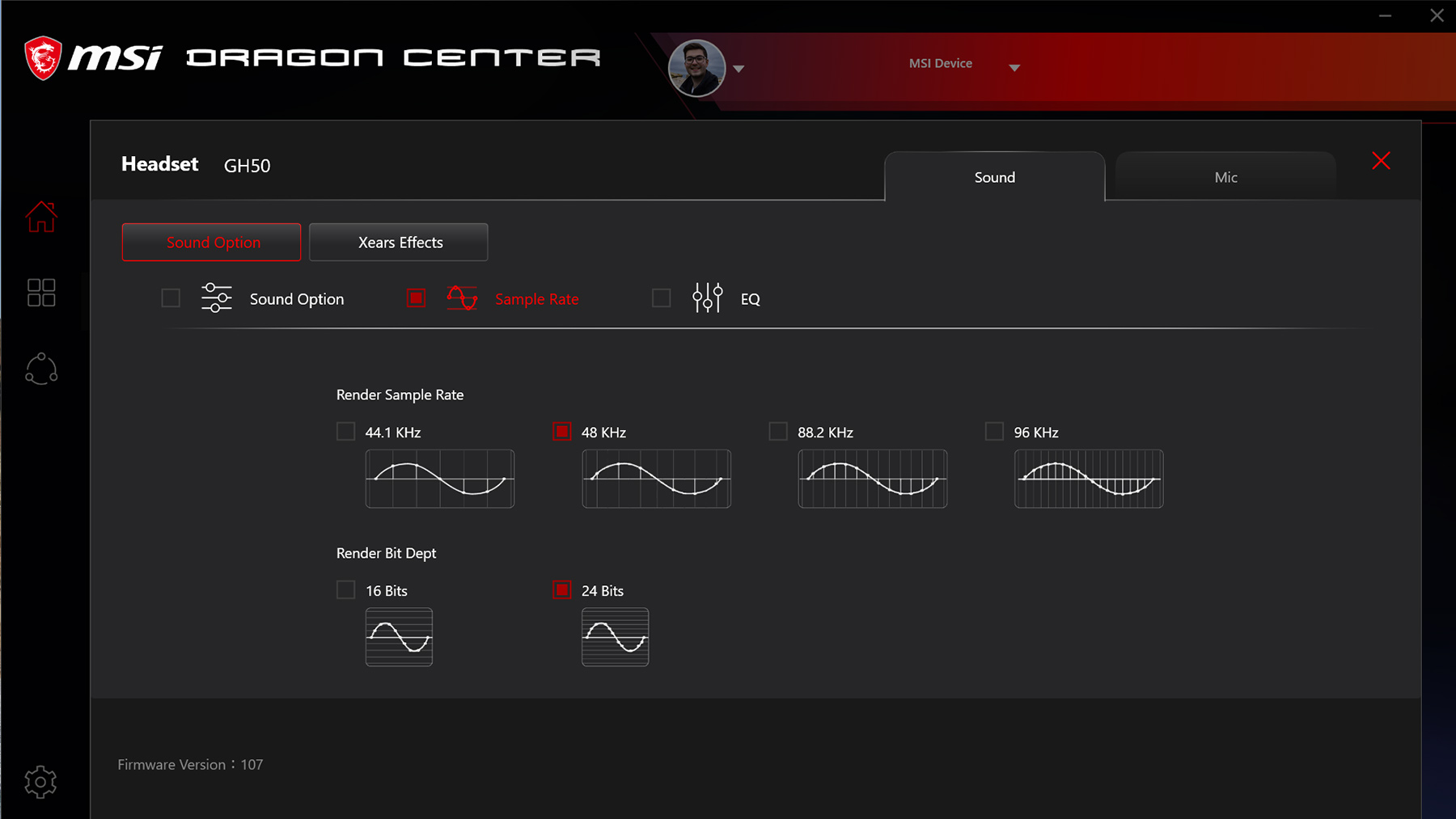 There's a few different tabs for the GH50 when you get into Dragon Center, but it's essentially split into ‘sound' and ‘mic' sections. Starting with the sound, the basic options are pretty straightforward – you can adjust volume levels for the left and right channels, choose your desired sample rate, and then adjust the headset EQ if you want to do so.