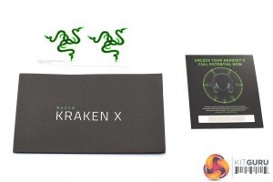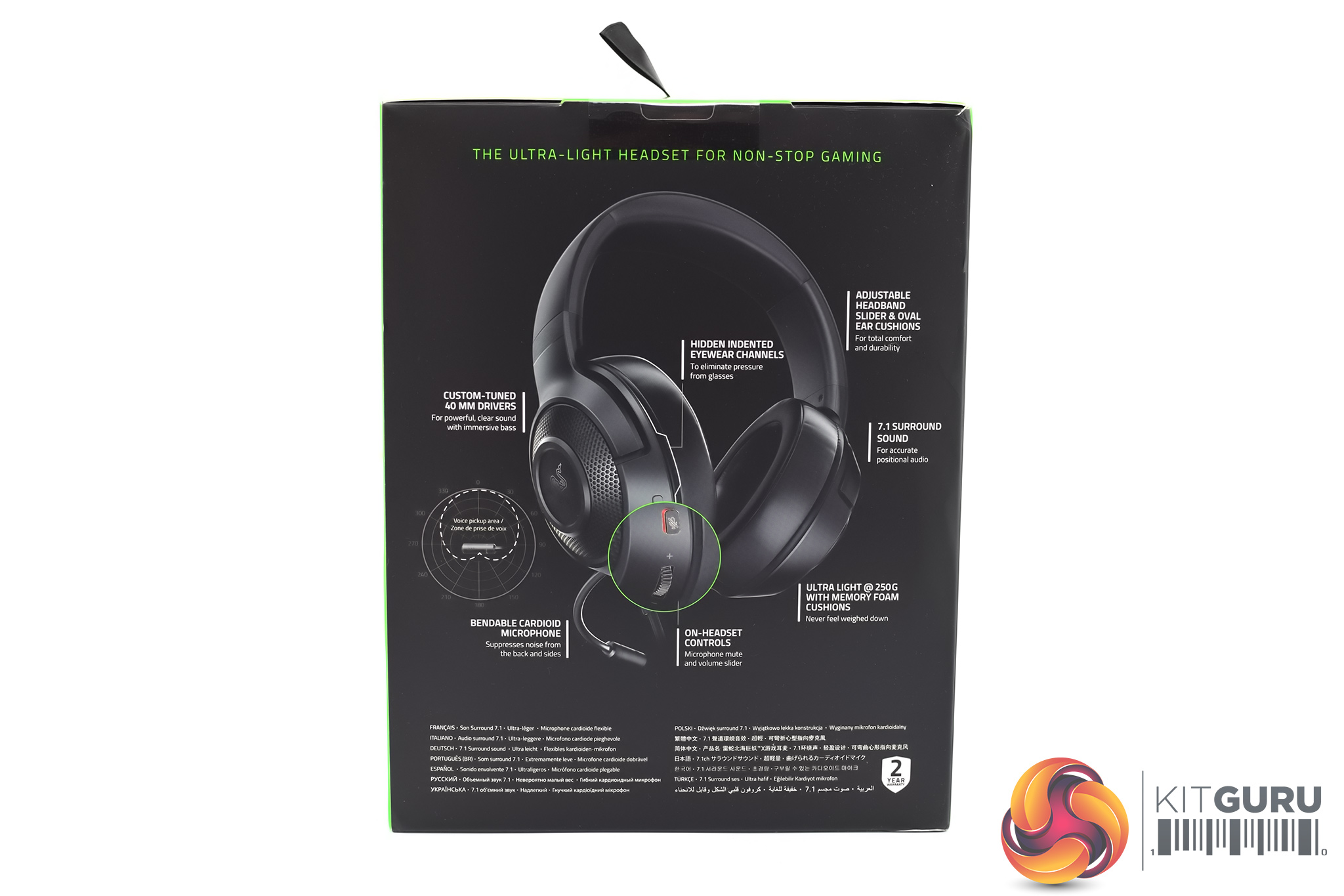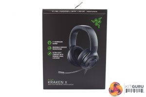 The Razer Kraken X ships in a black box, with Razer’s signature green accenting. A large image of the headset itself is visible on the front, while on the back Razer has highlighted several key features of the product.