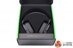 Inside, the headset itself is very neatly packaged in plenty of foam, while the accessories are hidden under the ‘welcome to the cult of Razer' cardboard flap.