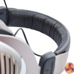 The headband is similar to the DT 990s as you have to get the size right before putting the headphones on. The padded headband and leatherette covering are nice and soft, though.