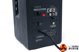 Also here is where you’ll find the connectivity and audio controls. Round the back are the spring clip connections for connecting up the left speaker, two sets of RCA sockets for connecting analogue inputs, a coaxial digital input and an optical digital input, along with a mains power switch.
