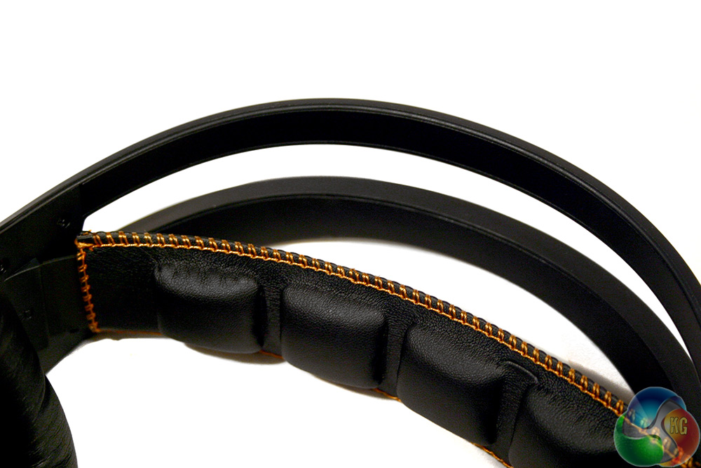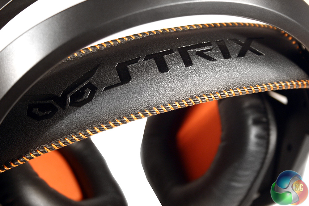 The headband is padded leather and features a really nice orange stitching along its edge. The STRIX logo can be seen written across the leather band, which is unattached to the plastic frame, so falls free when you are not wearing the headset.