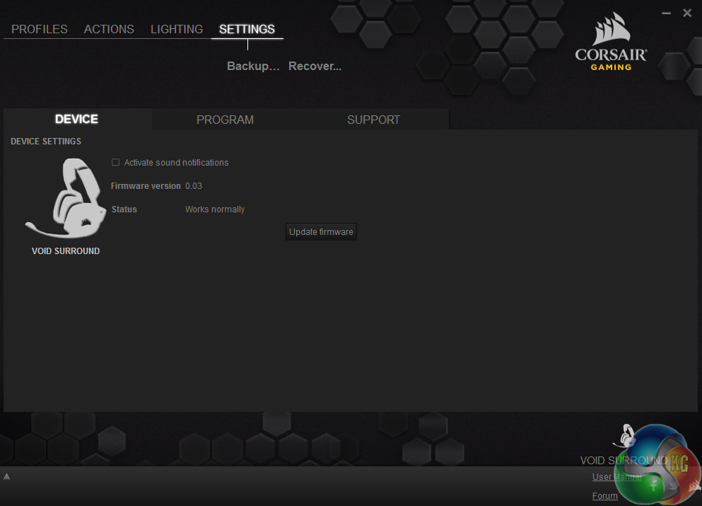 It is worth mentioning too that there was one feature I was unable to test during this review: the Corsair CUE visualiser system. This allows you to link up multiple Corsair peripherals together for unified light shows. For example, if you had a Corsair K70 RGB keyboard and the Void, you could have the lighting system on the board bounce along in time to your music. Likewise, the wireless Void headset can light up in-time with other Corsair peripherals.