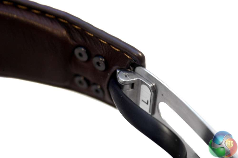 The inside of the headband has very fine, light-brown stitching and hex-head screws holding the whole construction together. There are also small indicators to let you know which earcup is left and which is right.