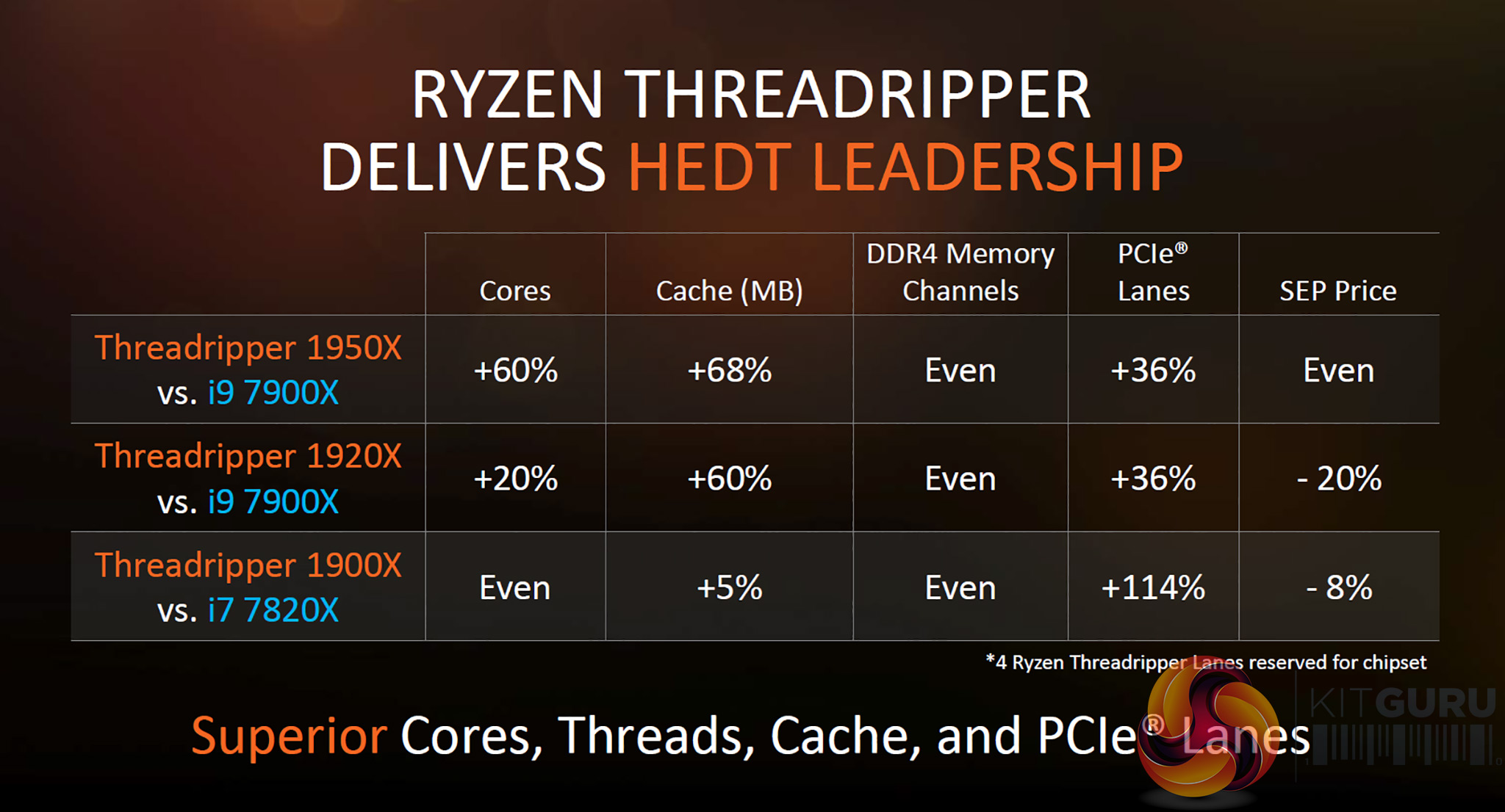 > “Essentially we’re talking about Ryzen 7 at a premium of US$50, however that small amount of money gets you 64 lanes of PCI Express and quad channel DDR4.”.