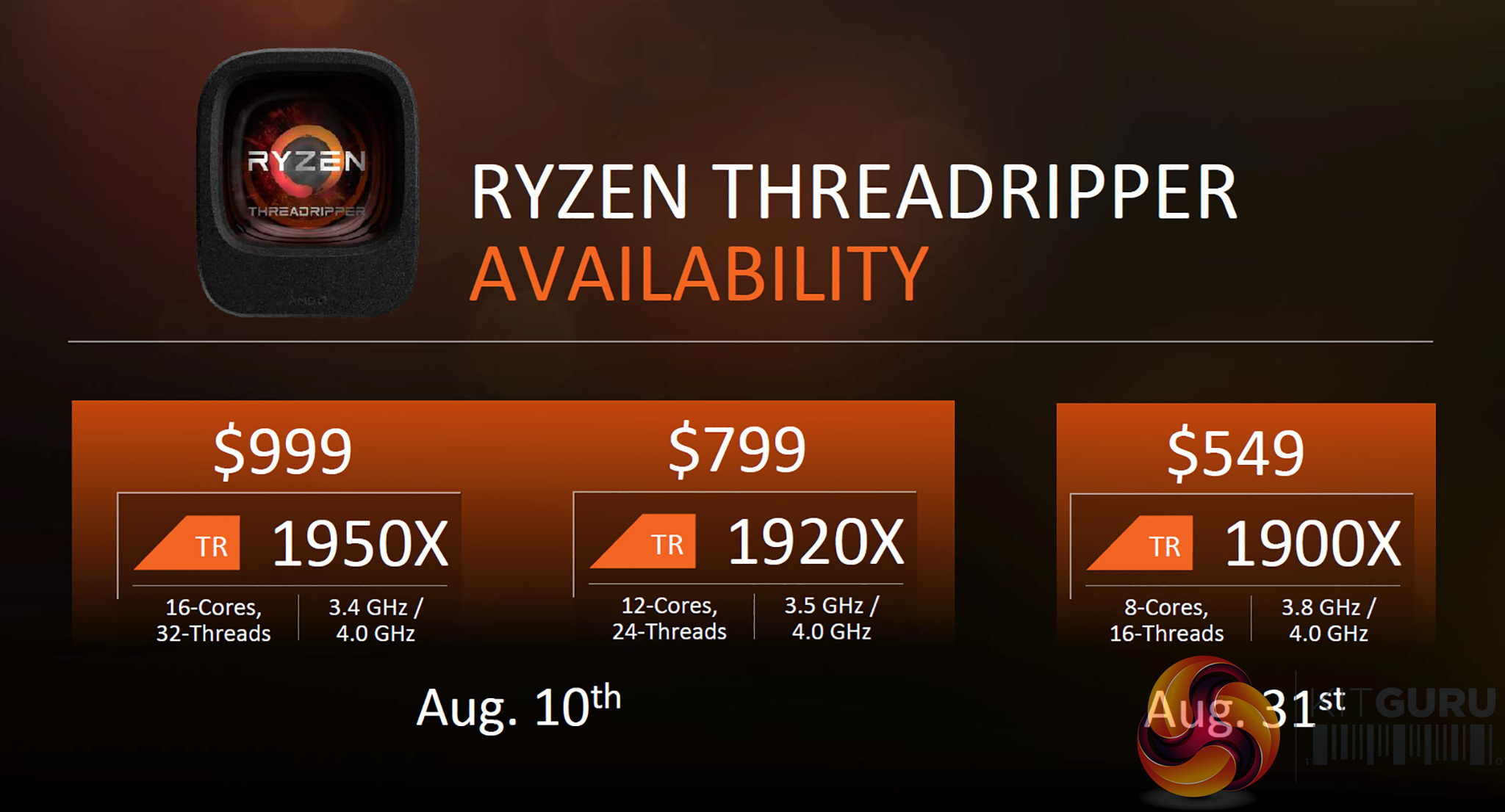 We already knew that AMD was due to release Ryzen Threadripper 1950X and 1920X in early August and at SIGGRAPH the date was confirmed as the 10th August. These 16 and 12 core chips are now due to be joined by an 8-core Ryzen Threadripper 1900X on 31st August with pricing as follows: