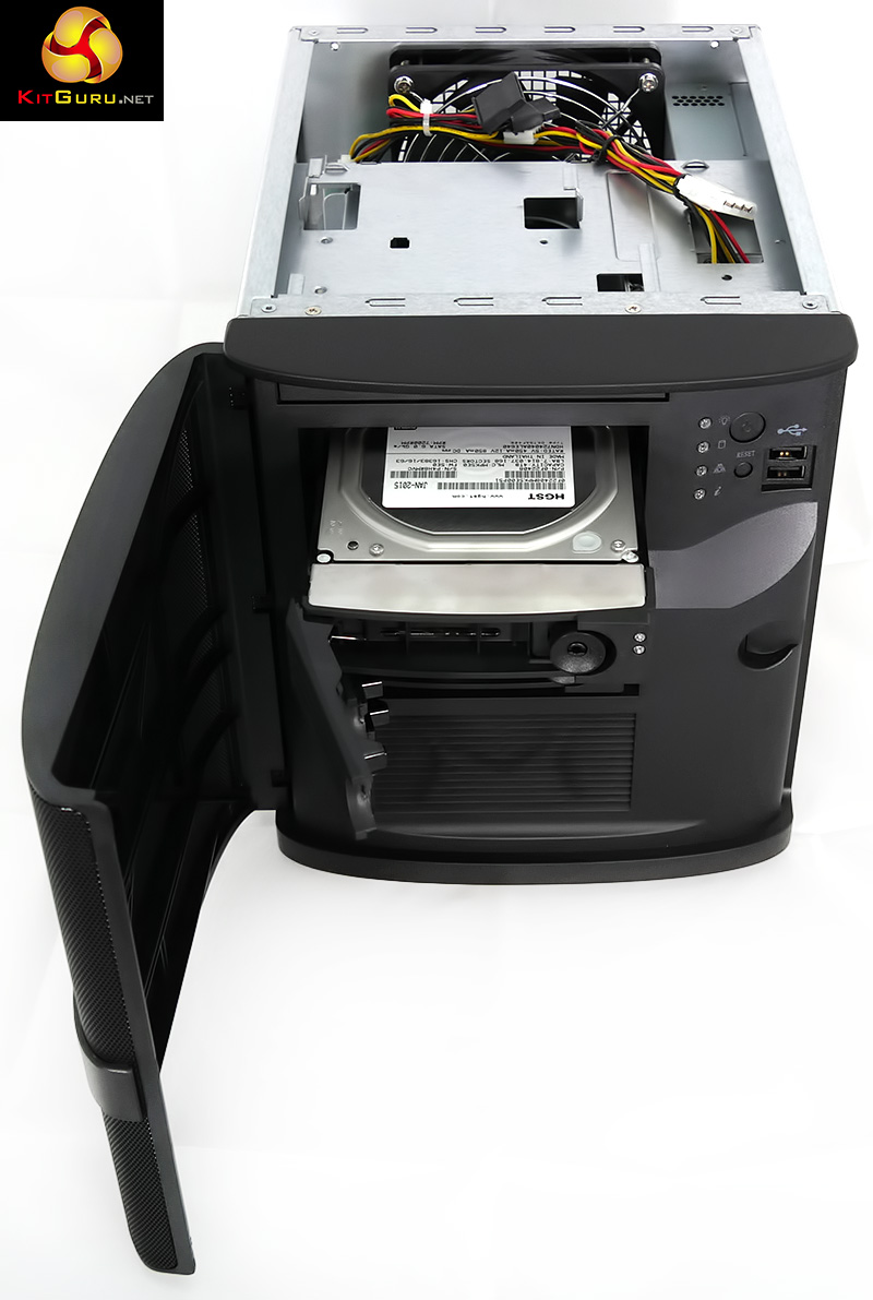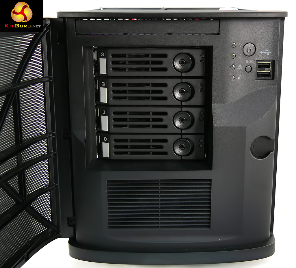 Open the door on the front of the chassis and you reveal the four drive caddies, the power and reset buttons and two USB 2.0 ports. The ports are only available for use when the door is open but at least means you won't forget your flash drive in a hurry.