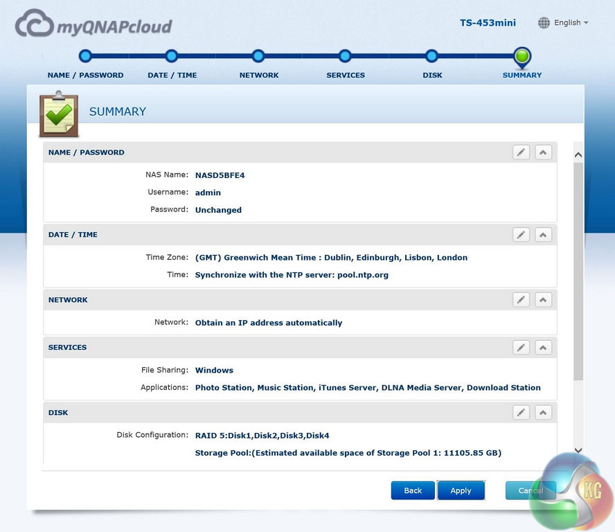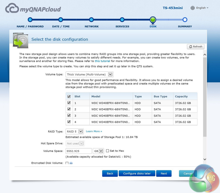 QNAP stands for Quality Network Appliance Provider and QTS for QNAP Turbo NAS System. You use details provided on a label on the side of the NAS to connect across your network and to start the process of installing the QTS software which pretty much boils down to clicking ‘next' a few times. If you accept default settings your four drive installation will employ RAID 5 to protect your data, which is the logical choice. QNAP allows you to select any level of RAID or drive configuration
