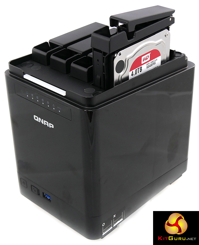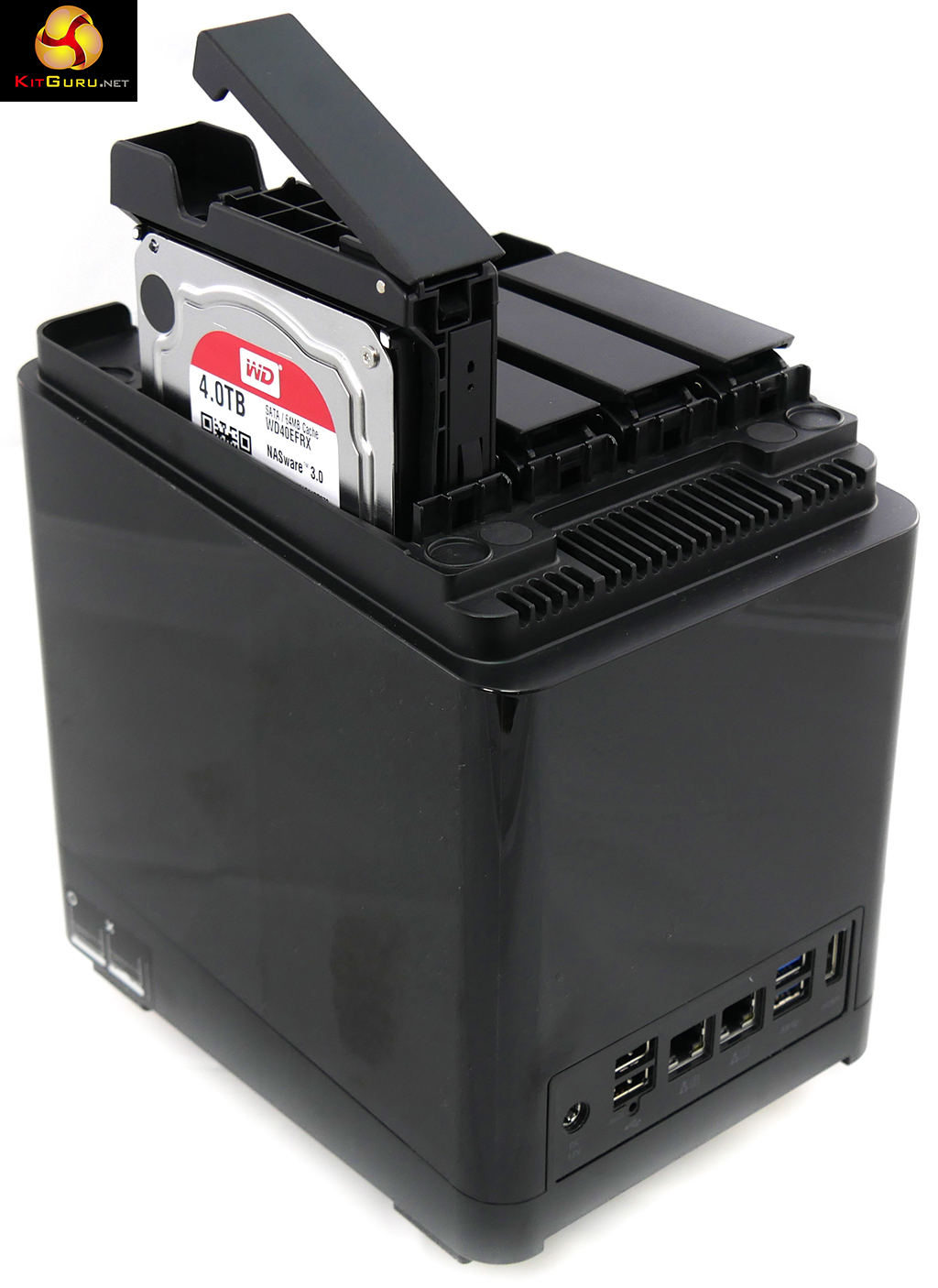 Installing drives in the TS-453mini is a simple matter of removing the magnetically retained top cover, installing drives in the four caddies (in this instance brand spanking new 4TB WD Red NAS drives) and sliding the caddies into place. When you use 3.5-inch drives it is an entirely tool-free operation, thanks to clip-on side rails, but if you use 2.5-inch drives you'll have to mount them in the caddies using screws.