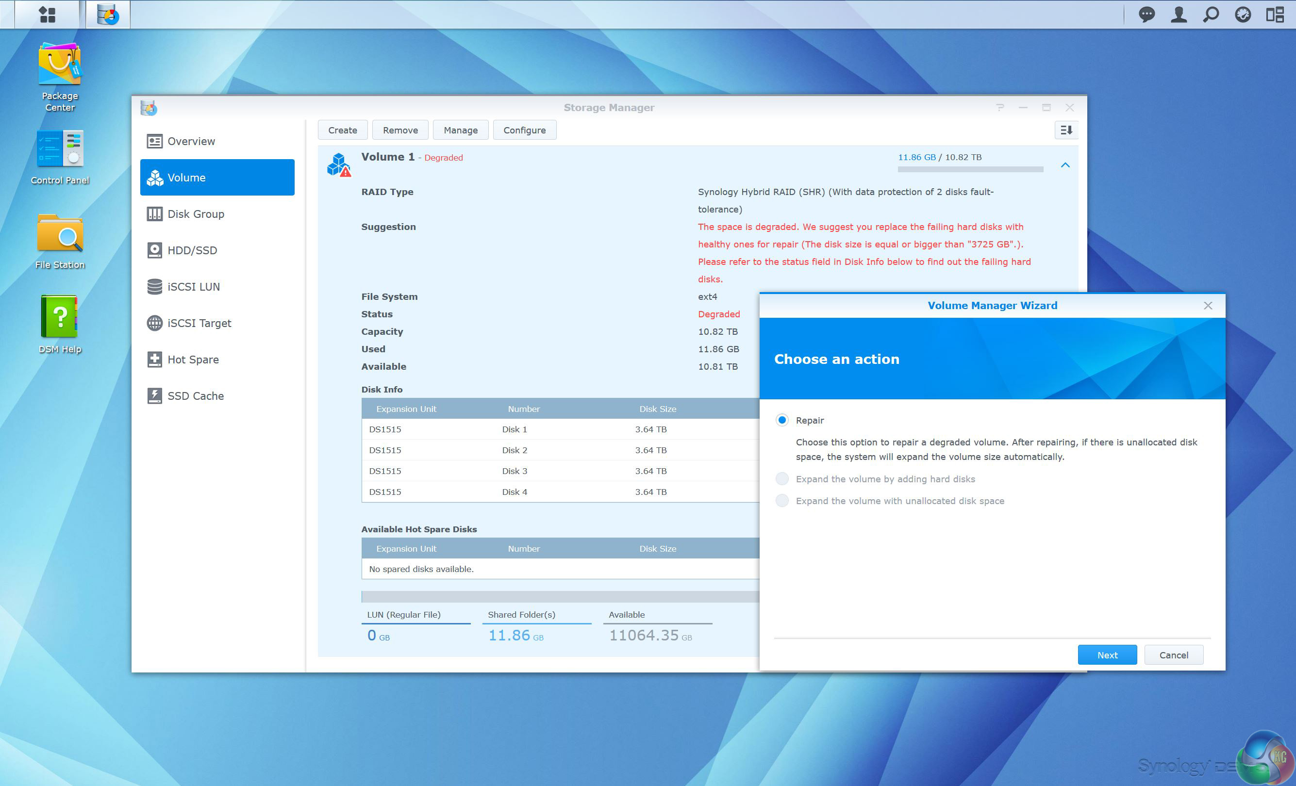 We tested the Synology DS1515 with five WD Red NAS hard drives. Ideally these would have been identical but in fact they were 4x 4TB and one 6TB drive, however this minor difference didn't cause any problems and the DSM 5.1 installation created an array with two redundant drives.