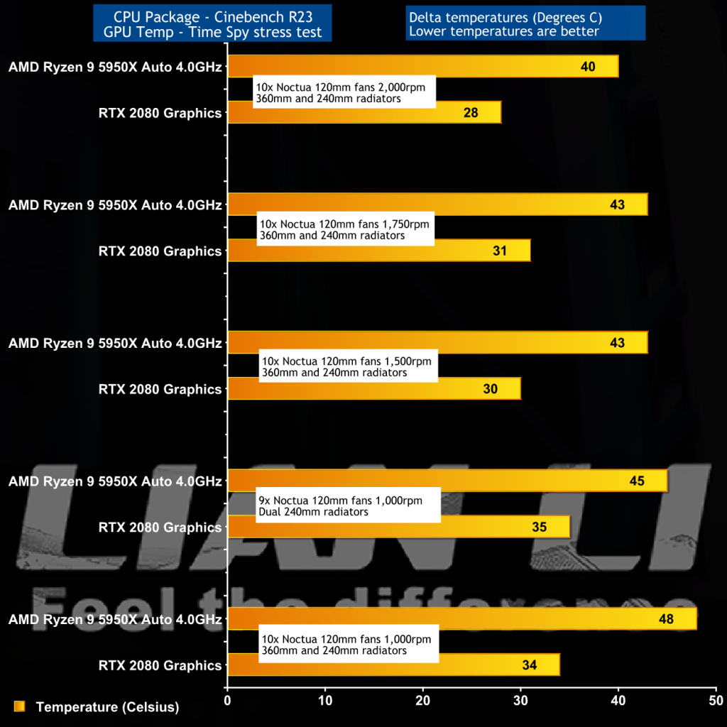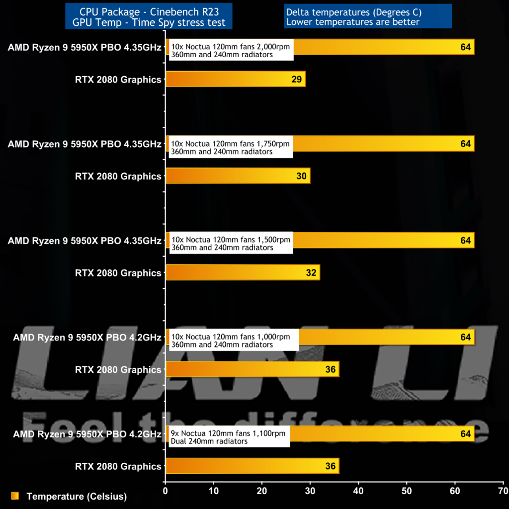 We walk through these charts in great detail in our video so this is just a quick summary of the facts. The two points to take away are that you can clearly see that changing the fan speed has a direct effect on the temperature of the CPU, and to a smaller extent on the GPU. The other thing is that we observed no benefit from ‘upgrading' from dual 240mm radiators to a combination of 240mm and 360mm. The finished PC looks really good however the work involved in moving the radiators around was fruitless.
