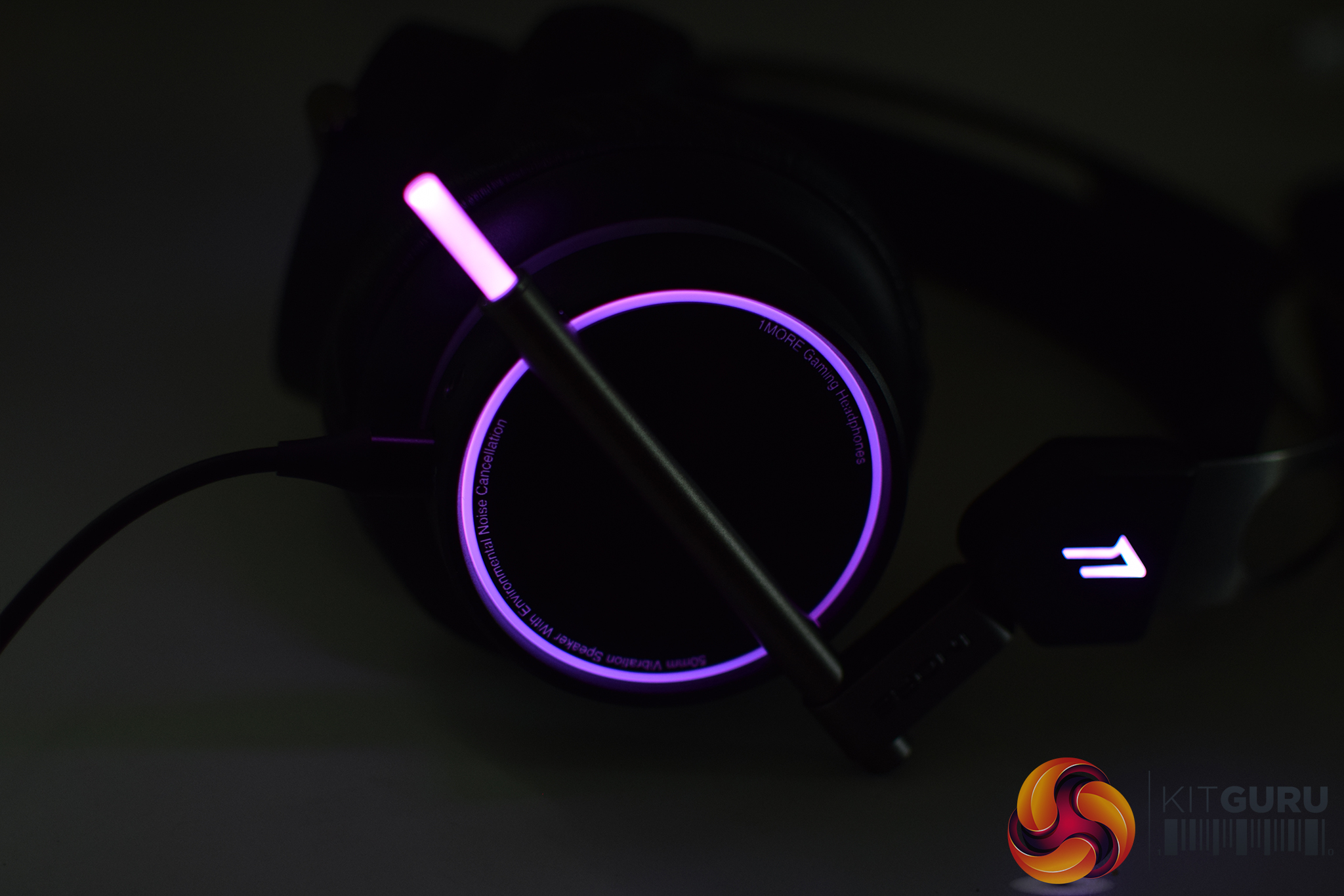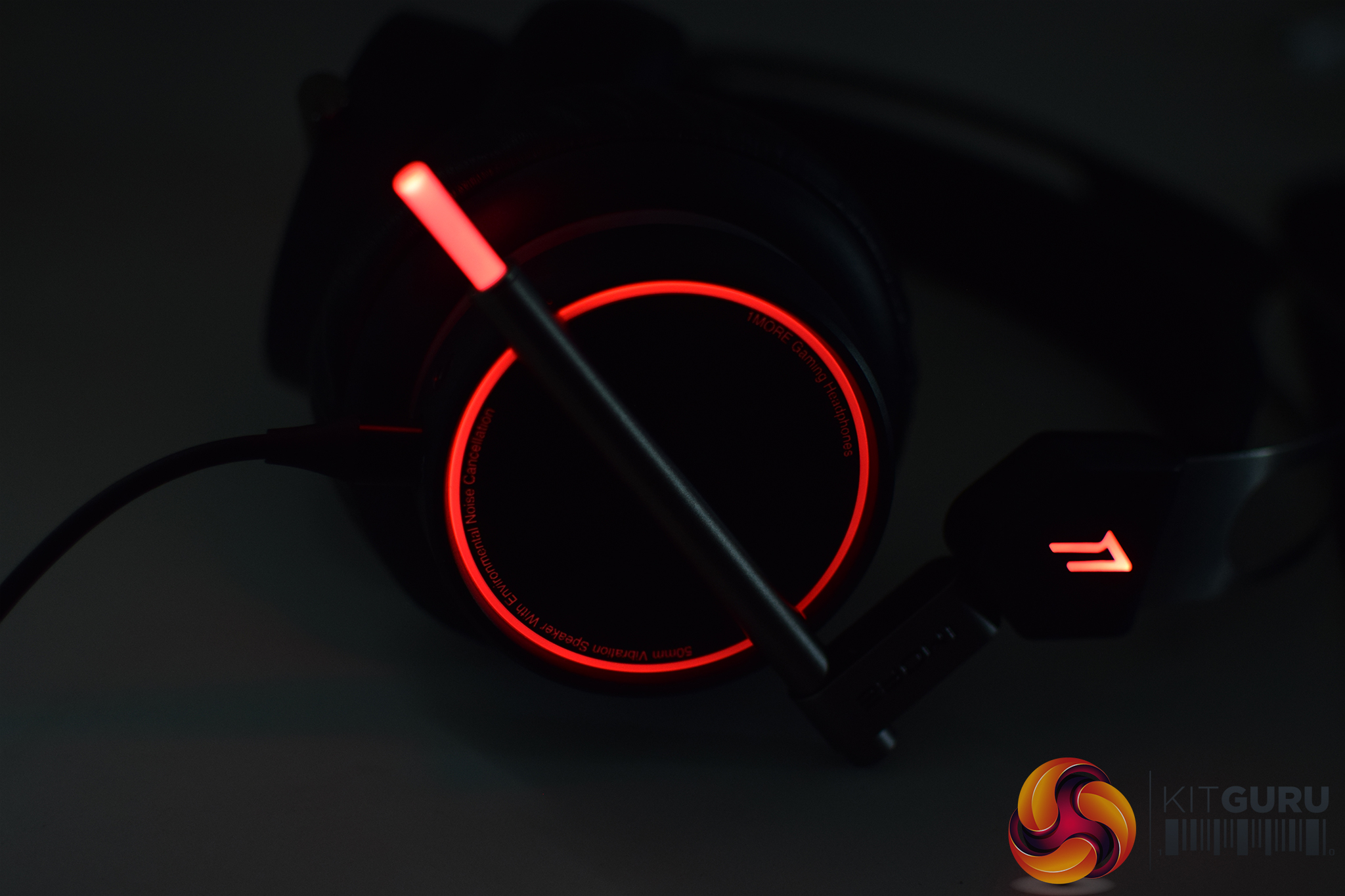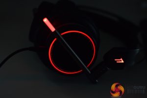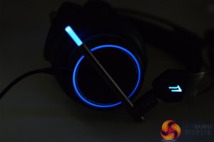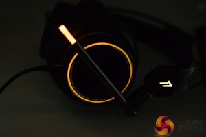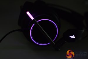 As far as RGB headsets go, this is one of the nicest we've come across. That tube-shaped LED at the end that looks like a microphone is actually a voice indication tool. There is a microphone embedded into the ear cup, so the LED is mainly there to hang just barely within field of view. It will pulse when it is picking up your voice, giving you visual indication that your microphone is active.