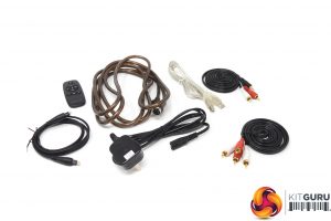 The box itself is quite heavy, these aren't cheap/light speakers after all. On the accessories front, you are immediately greeted with everything you'll need. This includes a thick and long left-right speaker connection cable, an optical cable, a USB cable, a standard power connector and two different AUX cables, one 3.5mm to dual RCA and another 3.5mm to quad RCA for maximum compatibility across different devices. There is also a handy remote so you can adjust audio settings without fumbling around the back of the speakers once they are set up.