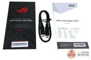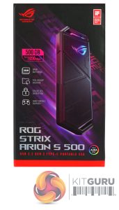 The ROG Strix Arion S500 comes in a tall, well-constructed box with an image of the drive on the front. To the left of the image is a label with the drives capacity and maximum performance figure (up to 1,050MB/s). Under this is a vertical row of icons describing some of the drives features; DRAM buffering, full backup solution, 256-bit AES encryption and game console support. At the bottom of the box, there is an Asus AURA sync support logo.