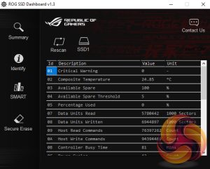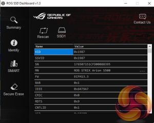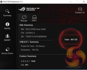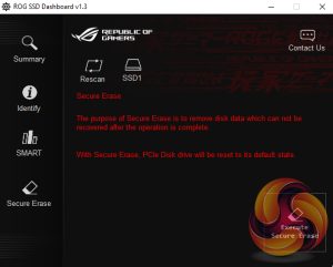 To look after the drive there is the ROG SSD Dashboard. This utility displays vital information such as drive temperature, storage status, health status, and supports secure erase of the drive.