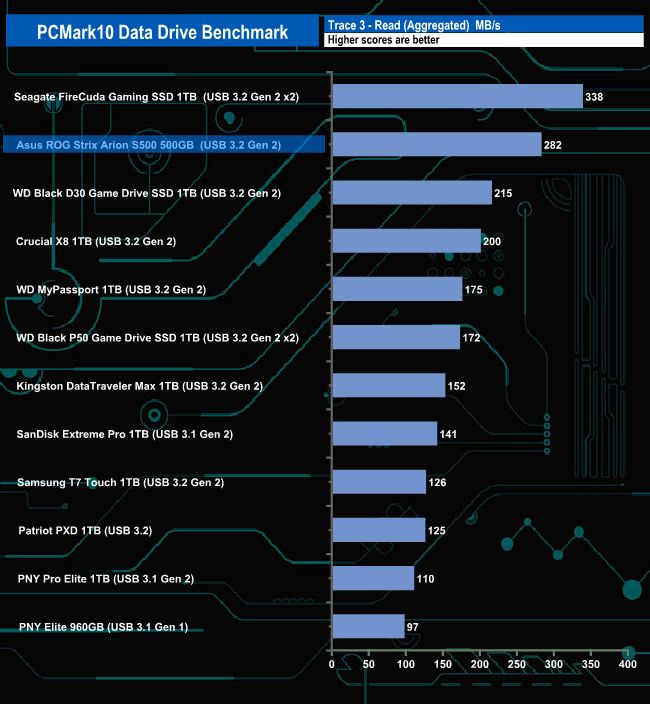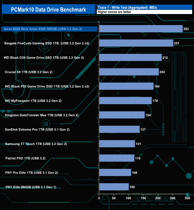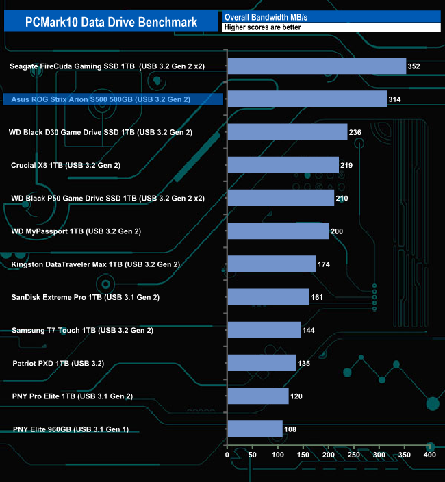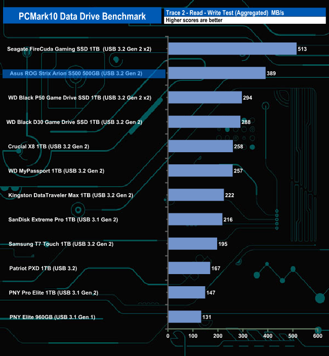 The Asus ROG Strix Arion S500 does very well in PCMark 10 Data Drive Benchmark topping the write test chart and in second place in the read/write and read tests. It also sits in second place, behind Seagate's FireCuda Gaming SSD (that uses a USB3.2 Gen 2 x2 interface) in the overall bandwidth chart.