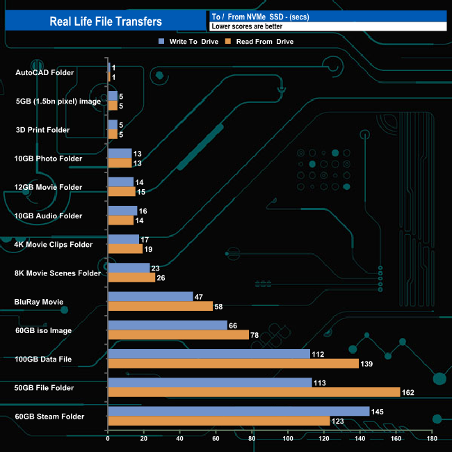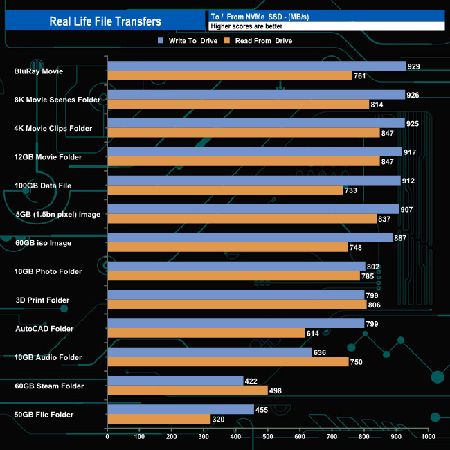 Transferring files between the Arion S500 and an M.2 NVMe drive we got an idea of the true potential of the Asus drive as transfer speeds rocketed. Write speeds averaged 793MB/s for the thirteen transfers with the average read speed coming in at 720MB/s.