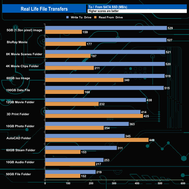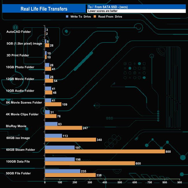 When transferring data to and from the Arion S500 to a SATA drive the drive averaged 421MB/s for writing the contents of the thirteen file transfers, with the fastest being the 5GB image (529MB/s), the slowest the 50GB file folder (219MB/s). When reading the data back, the drive averaged 233MB/s, this time the fastest transfer was the AutoCAD file folder at 449MB/s with the 50GB file folder again being the slowest at 152MB/s.